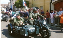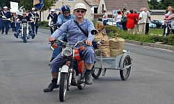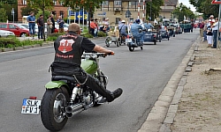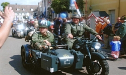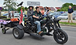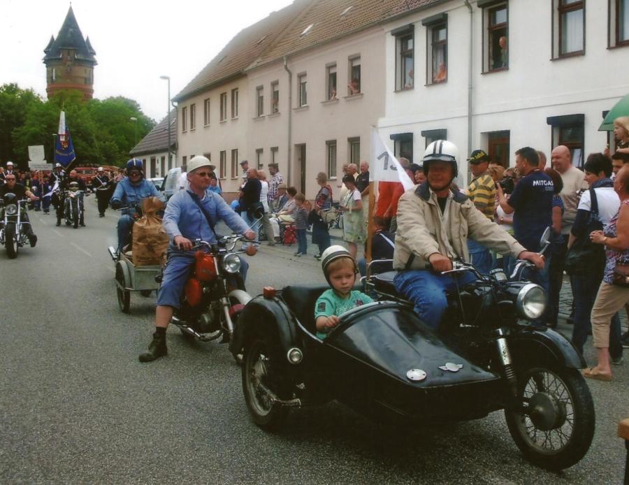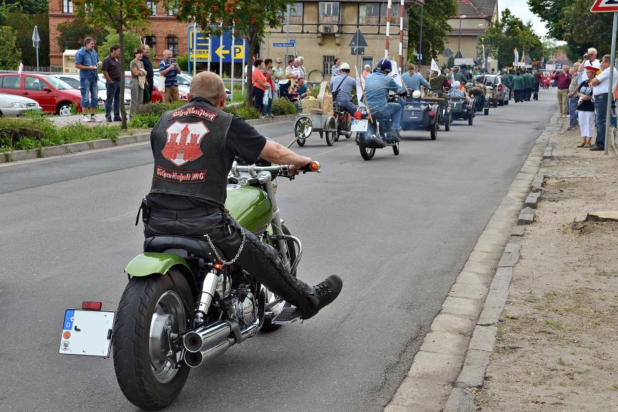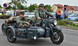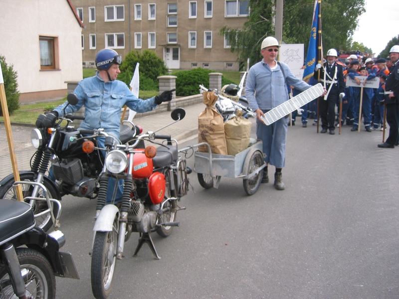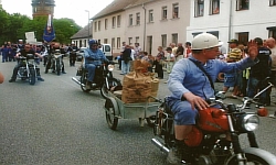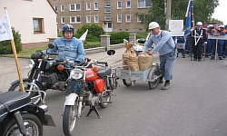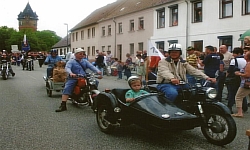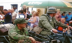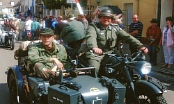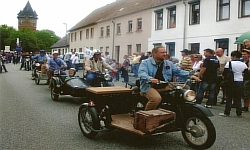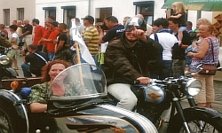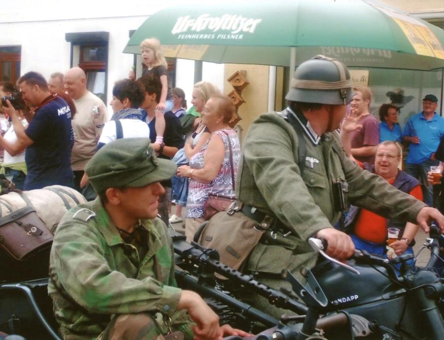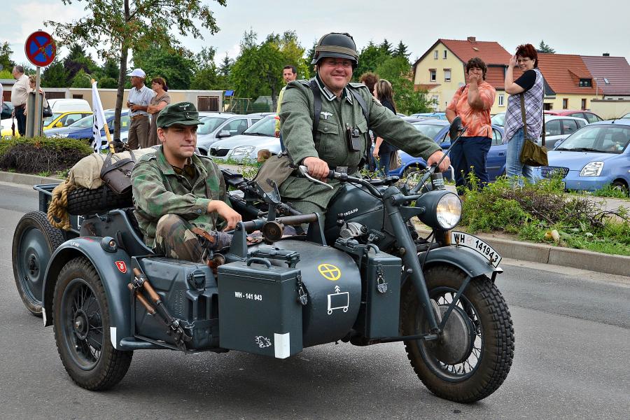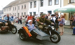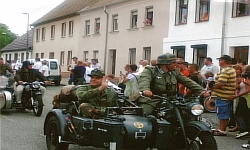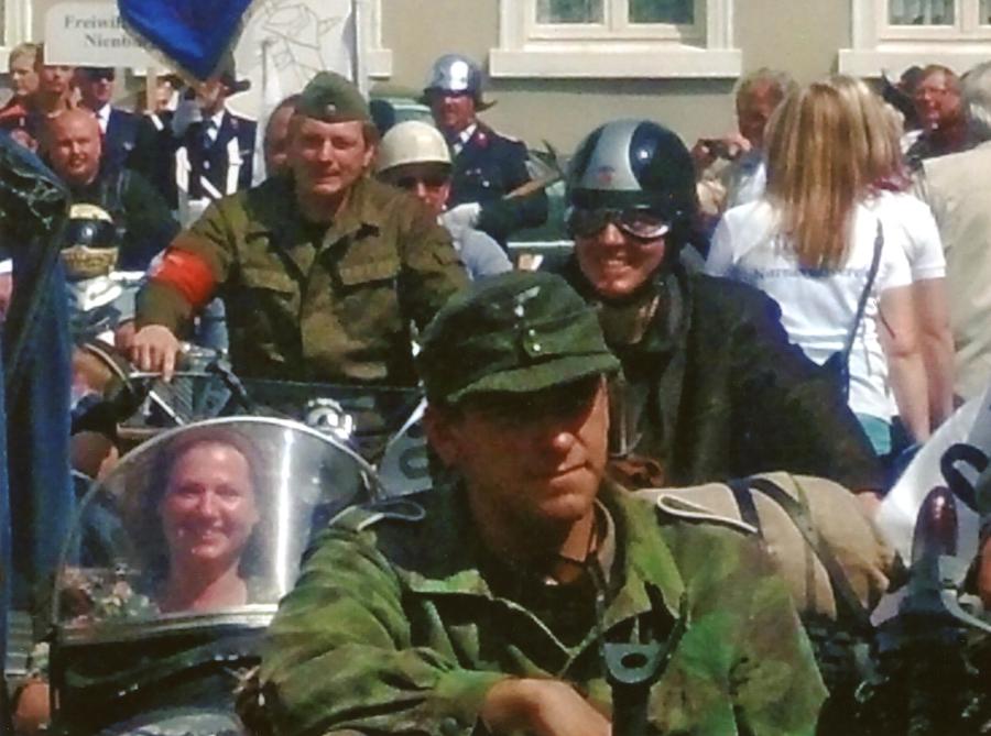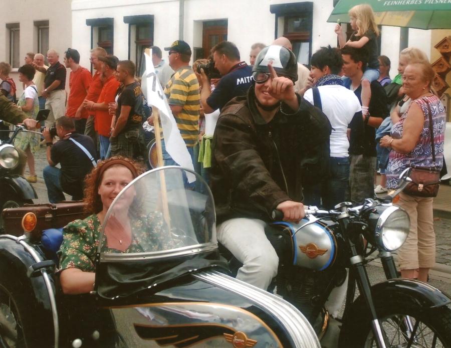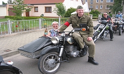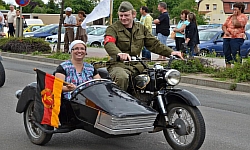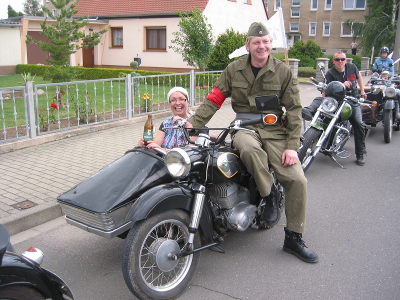 Für die 70er Jahre hat sich Bernd eine Einstrichkeinstrich-Uniform der NVA übergestreift und seine fleißige Hausfrau Diana in den Seitenwagen seiner MZ - ES250 geladen.