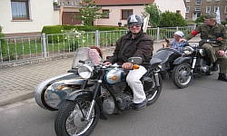 Für die 60er ist Uwe auf seinem MZ ES250-Gespann unterwegs, leger gekleidet wie das Jahrzehnt eben war.