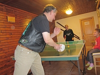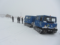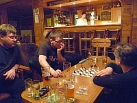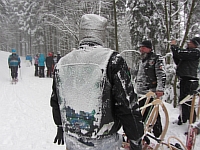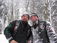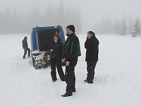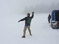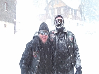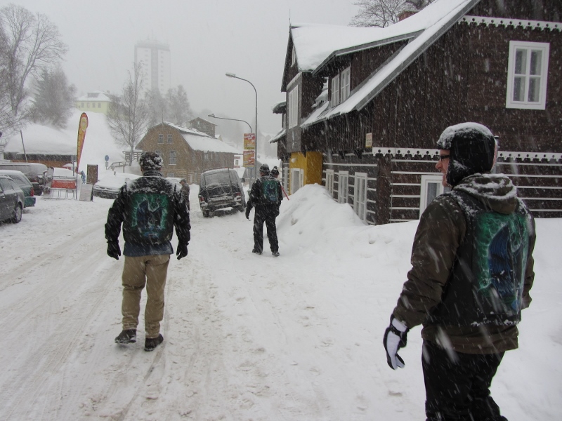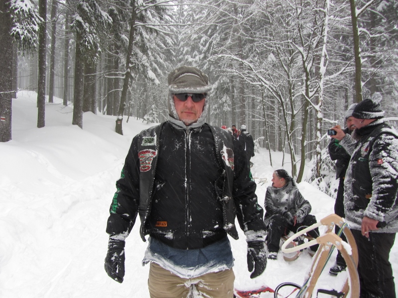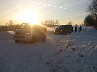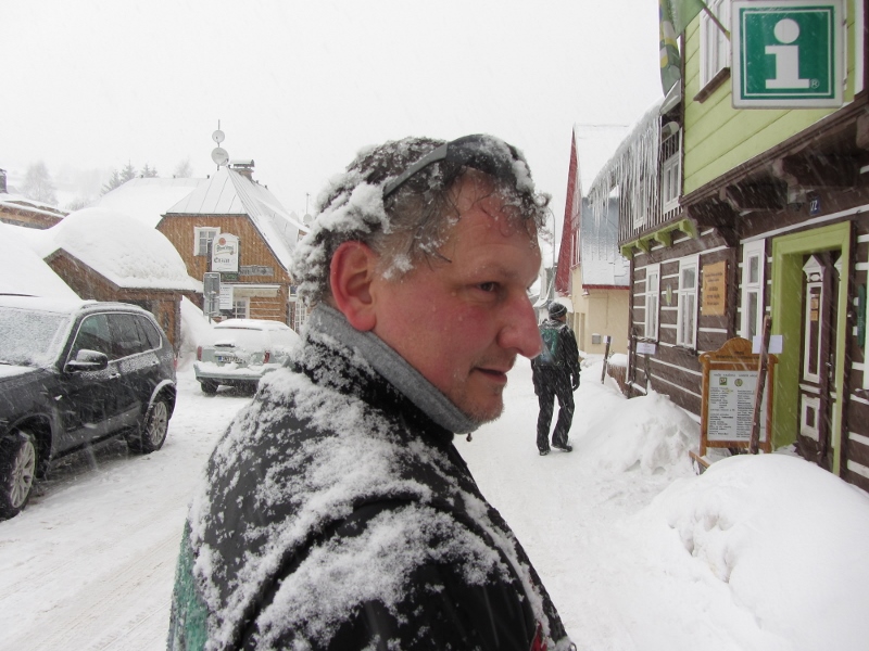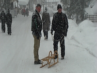 Klamotten jepackt un los, Schneeketten werden bestimmt nich gebraucht, de Winterreifen sin ja noch neu. Denkste! Schon de Auffahrt zur Bouda gerät zum Abenteuer. Bei Fuffzähn stehn 5 Mann in der Kofferklappe damit de Traktion beim Benz nich flöten jeht. Wenigstens nutzt es und er kommt oben an. Anders ergeht es Schwein, Frontantrieb beim VW-Bus, also rückwärts hoch, bis zur Hälfte un Schluss is. Schieben bringt noch 10 Meter un denn trampeln de Schieber sich jejenseitig off de Lunge rum.