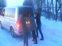 Rettung kommt vom Artur in Form seines alten Subaru, Strick dran un los jehts, aber was de Karre herjem will, da hatte Schwein alle Hänne voll zu tun um nich rechts un links gegen de Schneeberje zu knalln. Trotzdem jut oben anjekommen un fürn Rest des Urlaub werden de Blechkisten nich mehr bewecht.