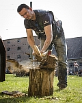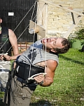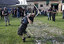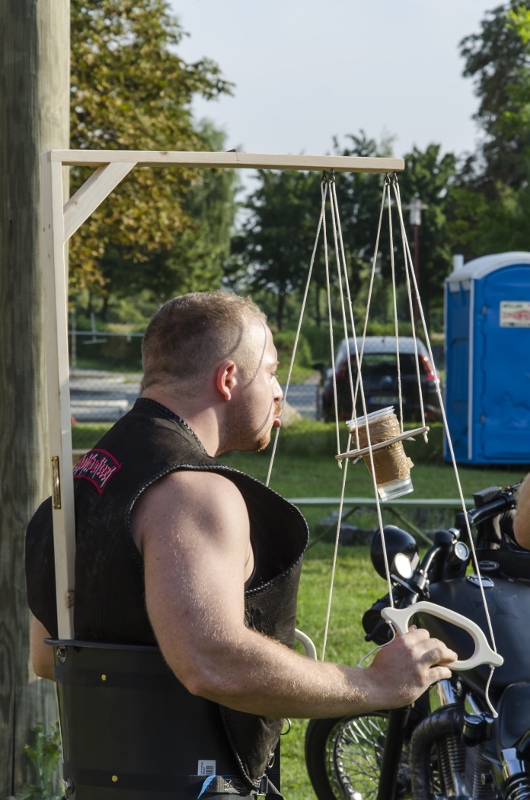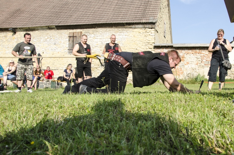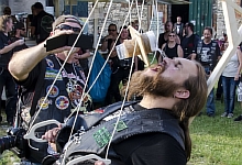 Als nächstes und das war neu. Die Biermarionette. Dabei wurde dem Spieler ein Gestell am Rücken befestigt, welches wie ein Galgen über den Kopf reichte. Am vorderen Ende sind Seile durch Ösen gezogen an welchen einerseits ein Brett und andererseits Griffe befestigt sind. In dem Brett ist ein Loch und in diesem steht ein Bierbecher. Nun hieß es den Becher mittels der Seilumlenkungen zum Mund führen und austrinken. Nach Zeit versteht sich.