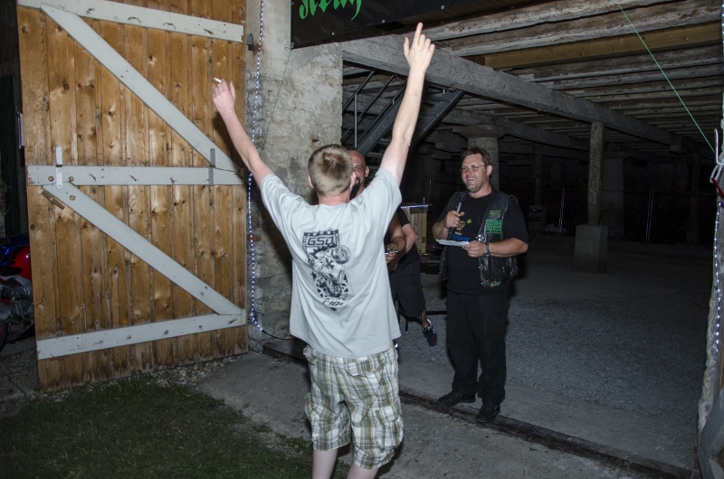 Ohne großen Rummel erst mal. Dosenmucke, Getränke, Benzingequatsche, Roster und der Abend ging gemütlich in die Nacht über. Großes Interesse bestand an unserer "BurnOut-Bar". Jeder BurnOut direkt an der Bar wurde mit einem Freigetränk nach Wahl belohnt. Selbst Fahrradreifen können Qualmen, kaum zu glauben!