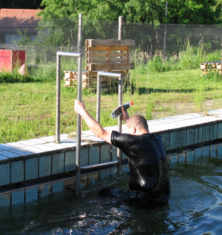 Ansage: Wer es sich holt ist Vollmember! Löwe und Mike waren kurz erstarrt und fingen an de Klamotten abzulegen, aber Mike ist dann gleich ma in voller Montur in de Brühe gesprungen.