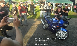 Sieg! Das lauteste Motorrad auf dem Platz wird von einer Frau gefahren. Lange Gesichter bei den Herren, aber anerkennendes Schulterklopfen.