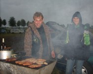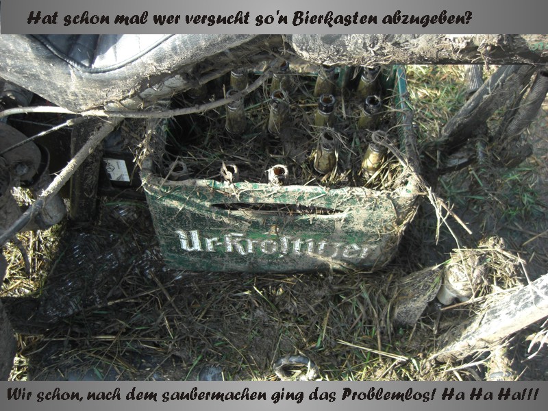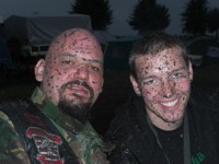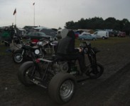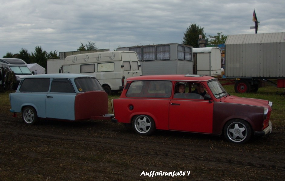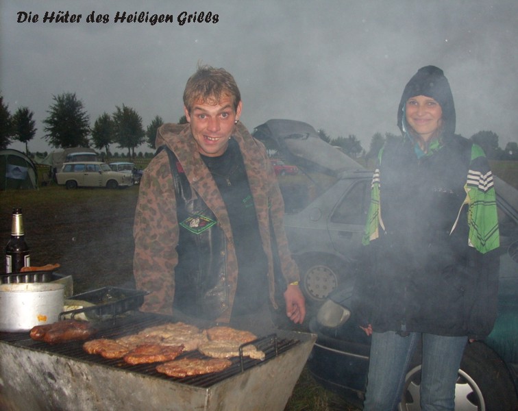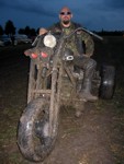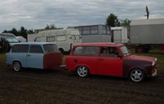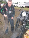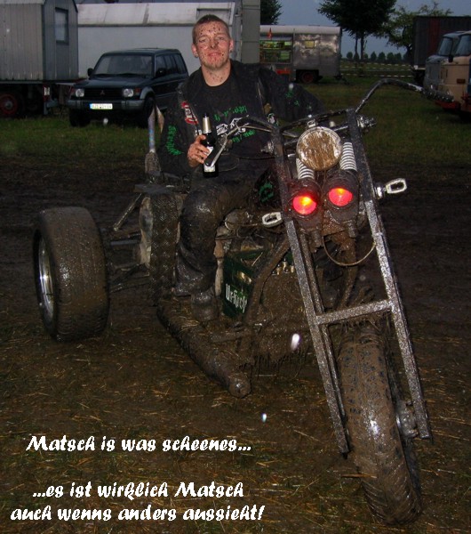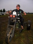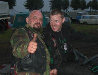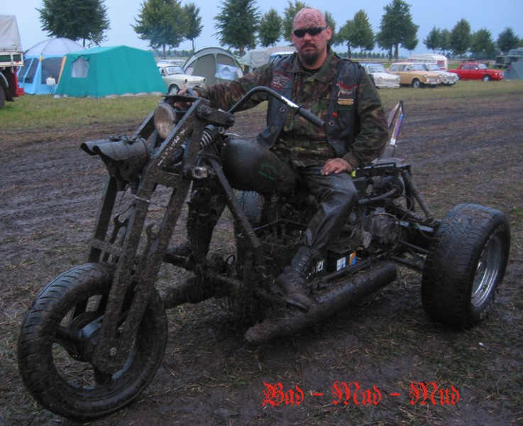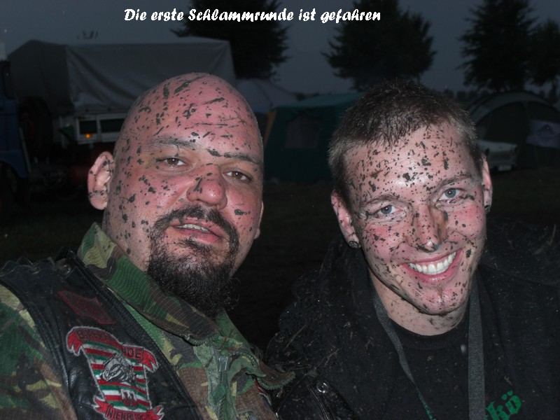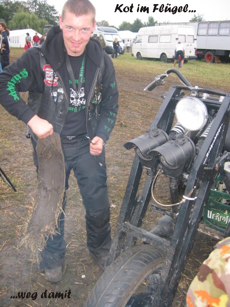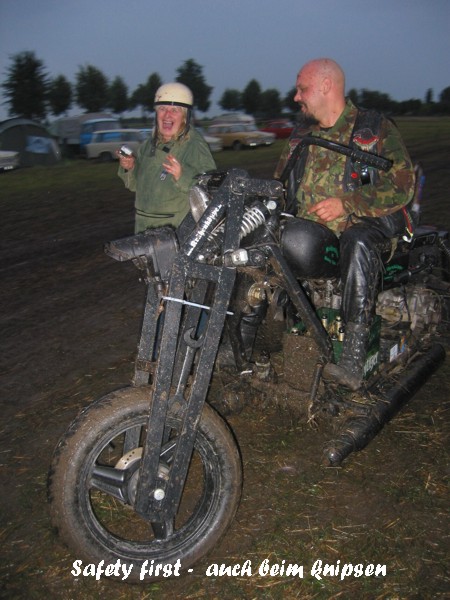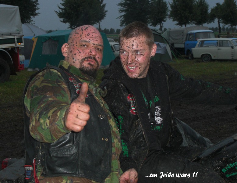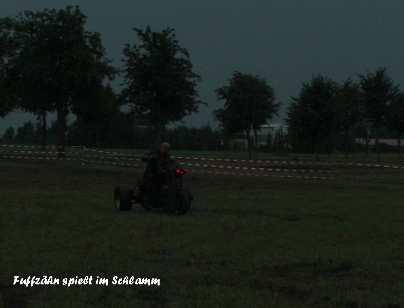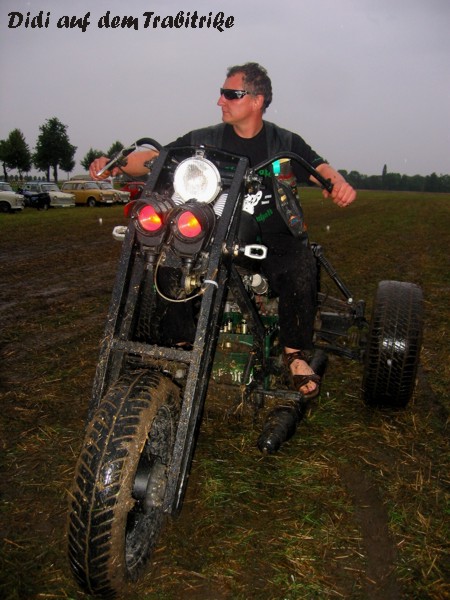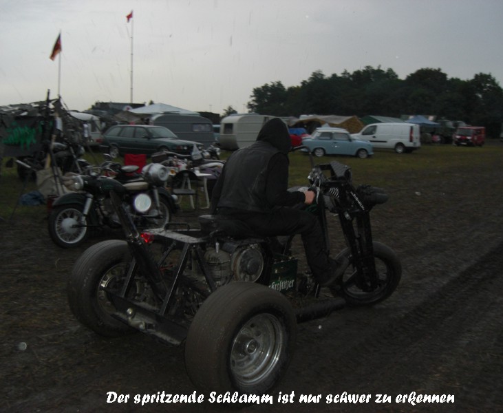 Aber richtig gewaltig wurde es als am späten Nachmittag Regen einsetzte. Die Zuschauer waren plötzlich alle weg und die Piste zwischen den Camps verwandelte sich in eine Schlammbahn. Sven und Fuffzähn ließen es sich nicht nehmen das Trabi-Trike im Drift über die Pisten zu jagen. Da blieb kein Auge trocken. Da es keine Schutzbleche gibt sahen beide aus wie die Schweine (und treckig gemacht ham se sich och noch) sieht man alles auf den Bildern.