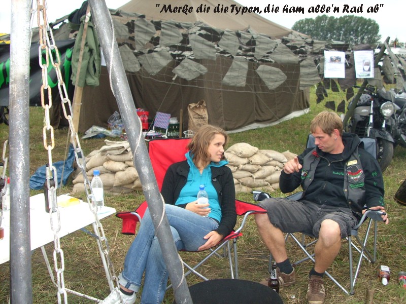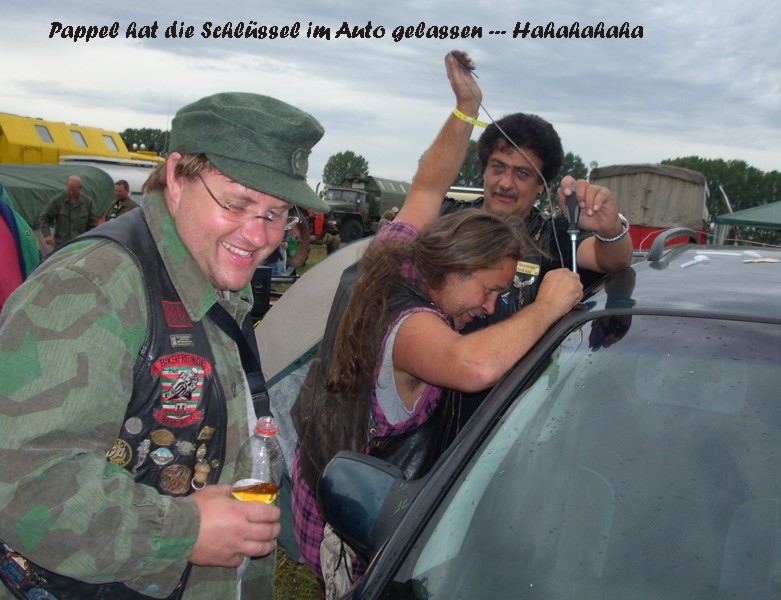 Samstag gab es erstmal Frühstück und einige Tassen Kaffee, pro Person versteht sich. Es fanden sich schnell neue Lagernachbarn, man machte sich bekannt und plötzlich hatte man schon wieder ein Bier in der Hand. Ist das Leben schön. Pappel vom Pech verfolgt hat seinen Autoschlüssel stecken lassen, verriegelt und zugeworfen.