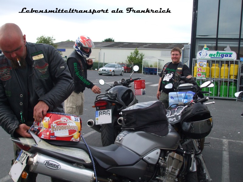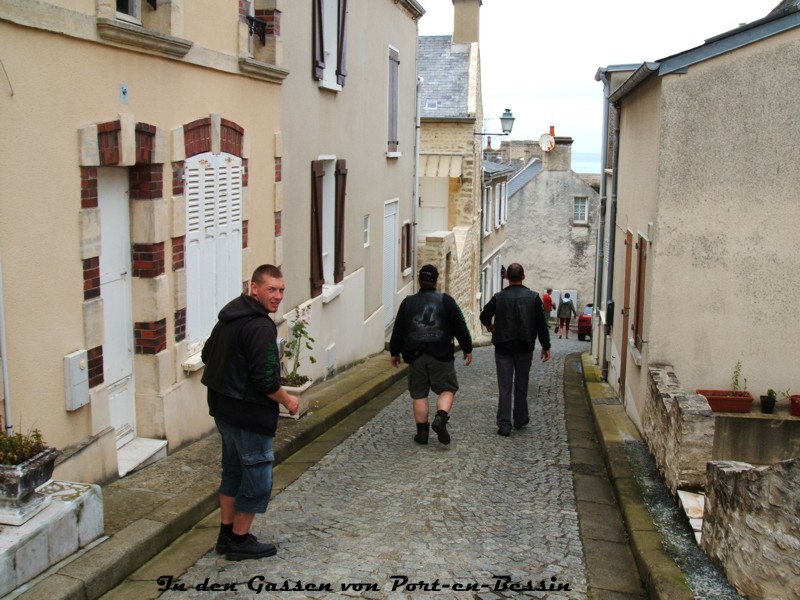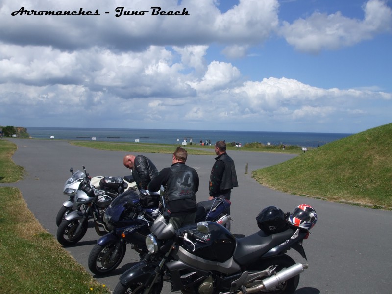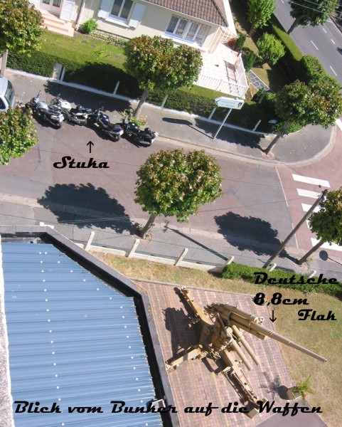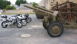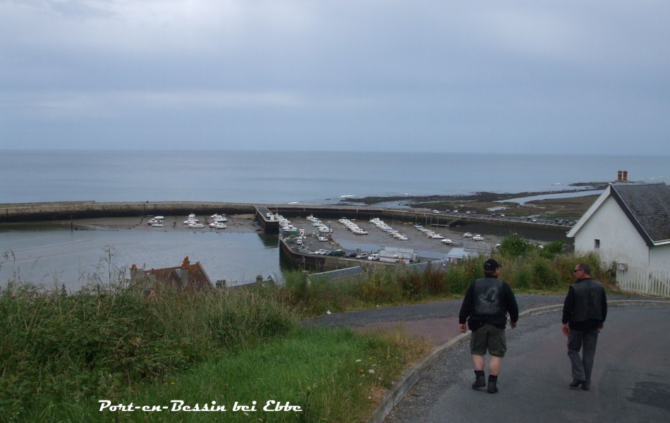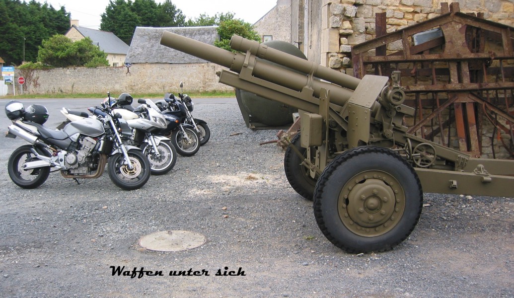 2. Tag: Nach einem ausgiebigen Frühstück (auf der Wiese, beim campen schmeckt's am besten) ging es los. Aber erst noch die Db-Absorber aus den Auspufftöpfen entfernt! Damit's knallt! Heute erst mal Ziele in der Nähe (wegen der Poposchonung), in Longues-sur-Mer besichtigten wir die ehemalige Deutsche 15 cm Geschützbatterie. Weiter ging es nach Arromanches-les-Beins, dort liegen heute noch die Pontons von der Landung der Alliierten am 6.Juni 1944 am Strand. Am Atlantik entlang fuhren wir nach Ouistreham, immer wieder hielten wir an um uns Interessantes anzusehen. Am Ziel angekommen, steht mitten im Ort ein mehrstöckiger Bunker, welcher Teil des Atlantikwall war und jetzt ein Museum ist. Zurück zum Zeltplatz, noch schnell unterwegs eingekauft der Transport der Lebensmittel war traditionell wieder sehr abenteuerlich. Der Tag klang mit leckeren Spirituosen (Calvados) aus der Region aus.