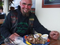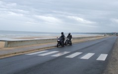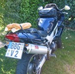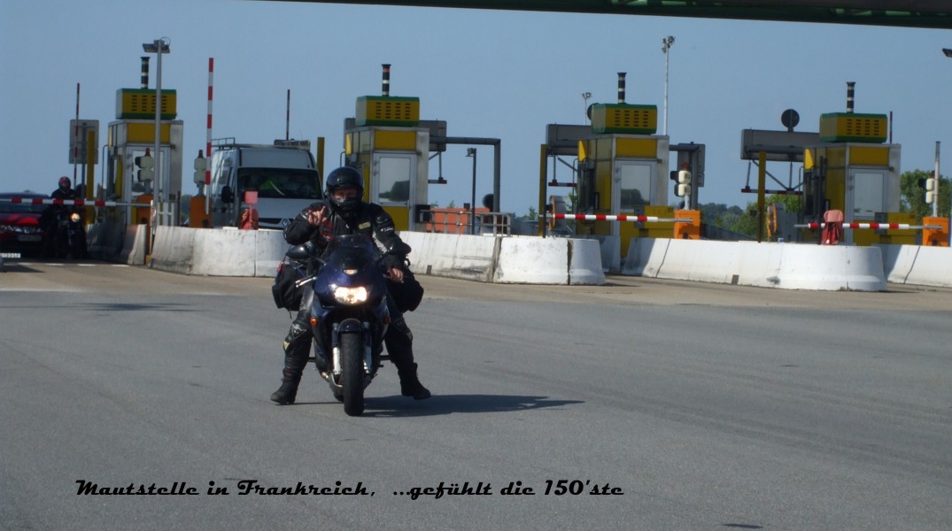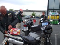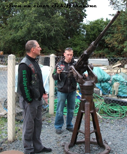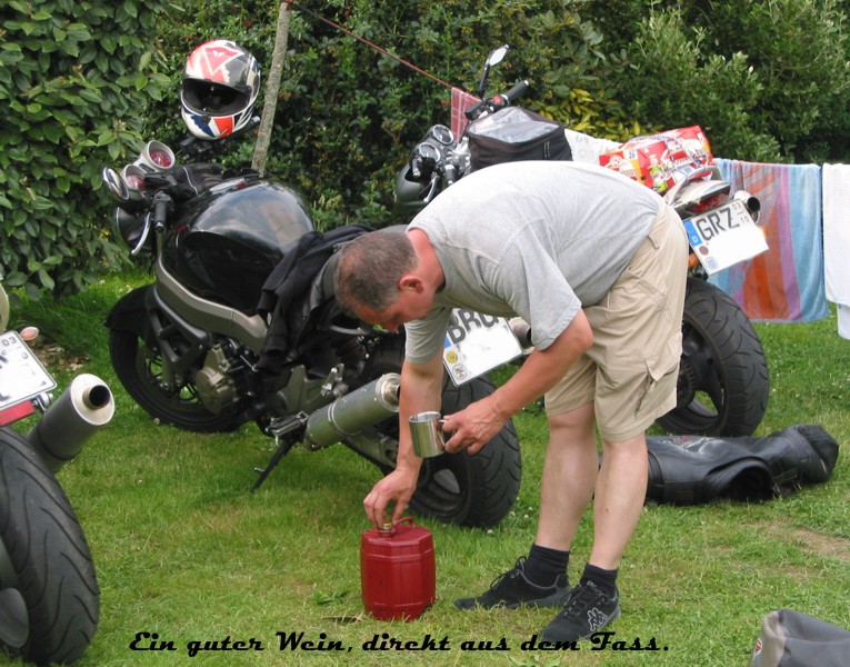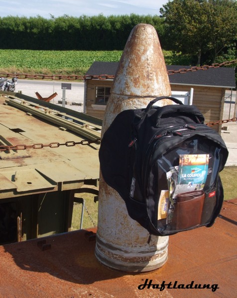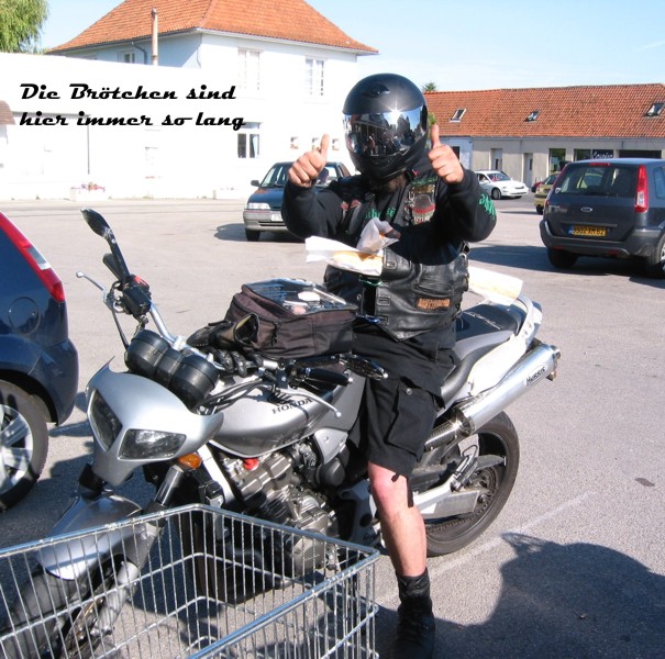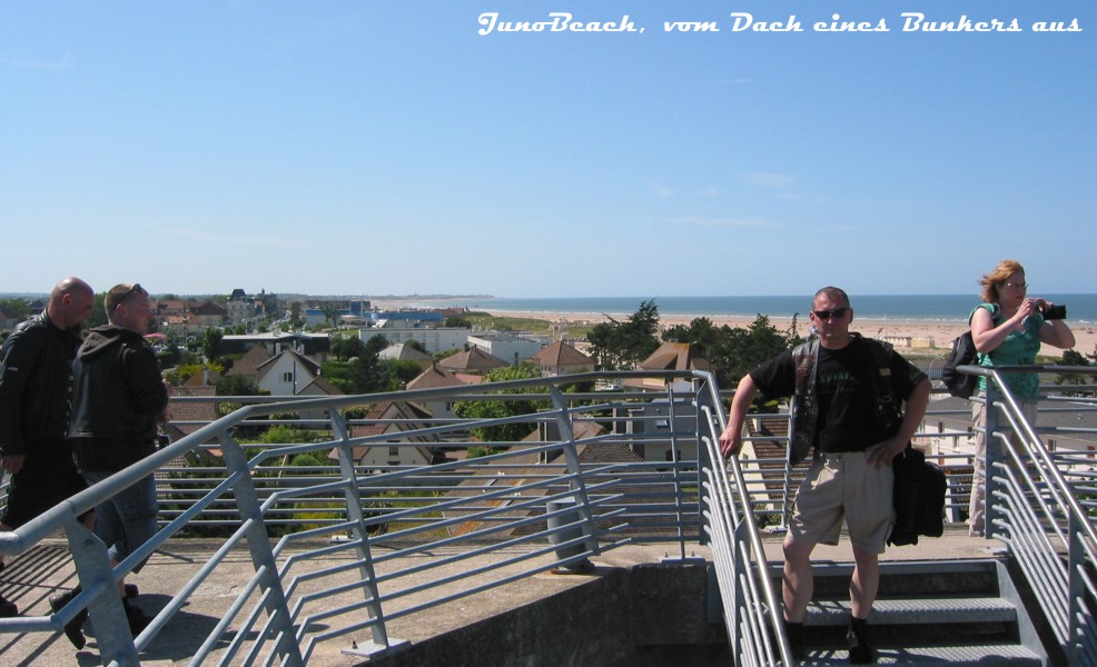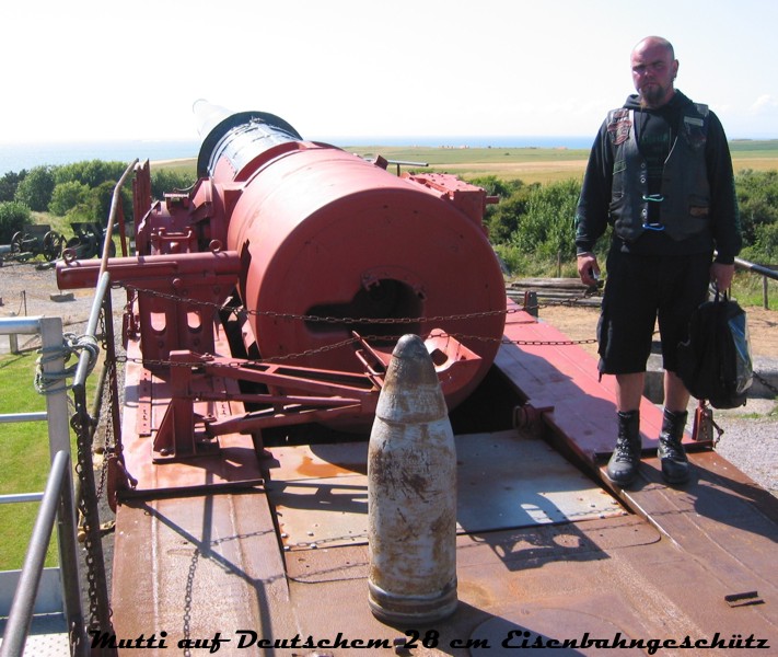 2. Tag: Nach einem ausgiebigen Frühstück (auf der Wiese, beim campen schmeckt's am besten) ging es los. Aber erst noch die Db-Absorber aus den Auspufftöpfen entfernt! Damit's knallt! Heute erst mal Ziele in der Nähe (wegen der Poposchonung), in Longues-sur-Mer besichtigten wir die ehemalige Deutsche 15 cm Geschützbatterie. Weiter ging es nach Arromanches-les-Beins, dort liegen heute noch die Pontons von der Landung der Alliierten am 6.Juni 1944 am Strand. Am Atlantik entlang fuhren wir nach Ouistreham, immer wieder hielten wir an um uns Interessantes anzusehen. Am Ziel angekommen, steht mitten im Ort ein mehrstöckiger Bunker, welcher Teil des Atlantikwall war und jetzt ein Museum ist. Zurück zum Zeltplatz, noch schnell unterwegs eingekauft der Transport der Lebensmittel war traditionell wieder sehr abenteuerlich. Der Tag klang mit leckeren Spirituosen (Calvados) aus der Region aus.