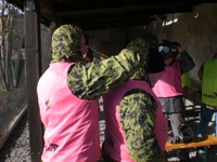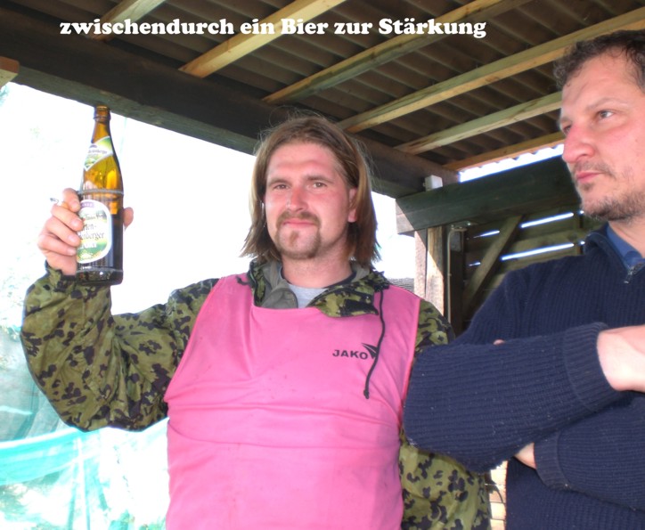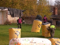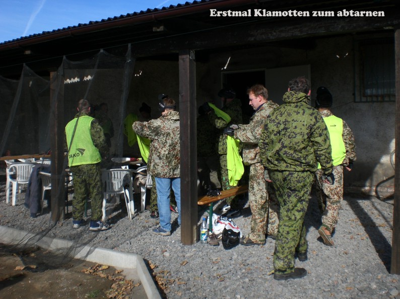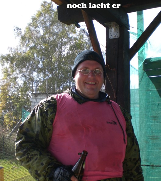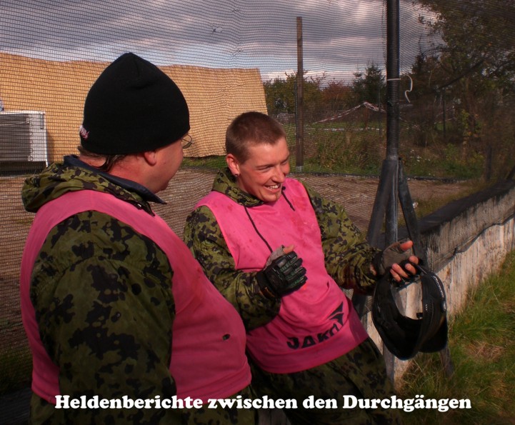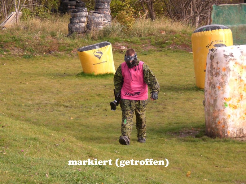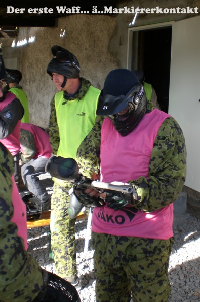 Ob es schmerzt, wenn man einen gut gezielten Treffer kassiert? Die Markierer (Waffen) zogen jedenfalls gut durch und wenn die Farbkugeln gegen die Wand schlugen klatschte das nicht schlecht. Na, wir werden spüren.
