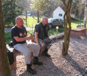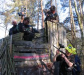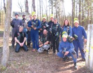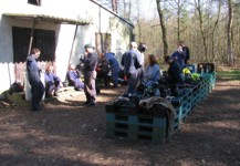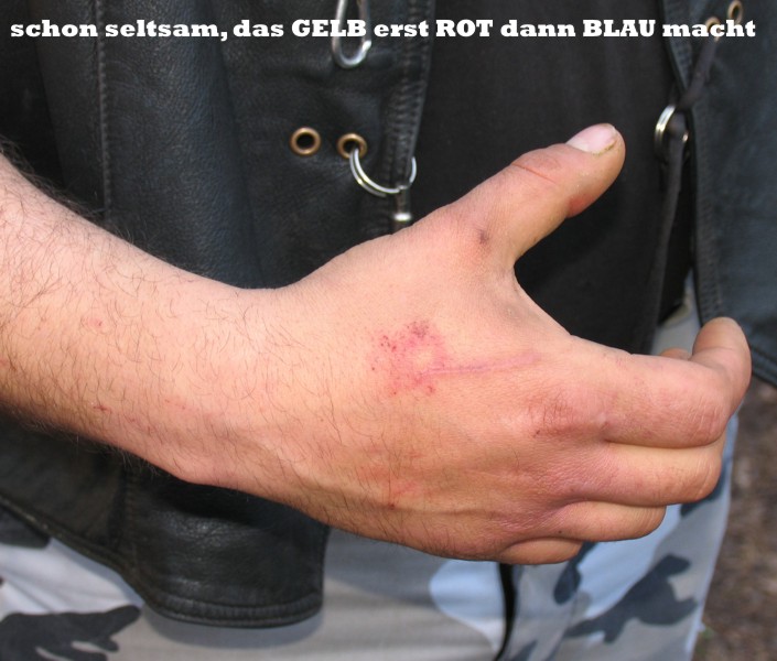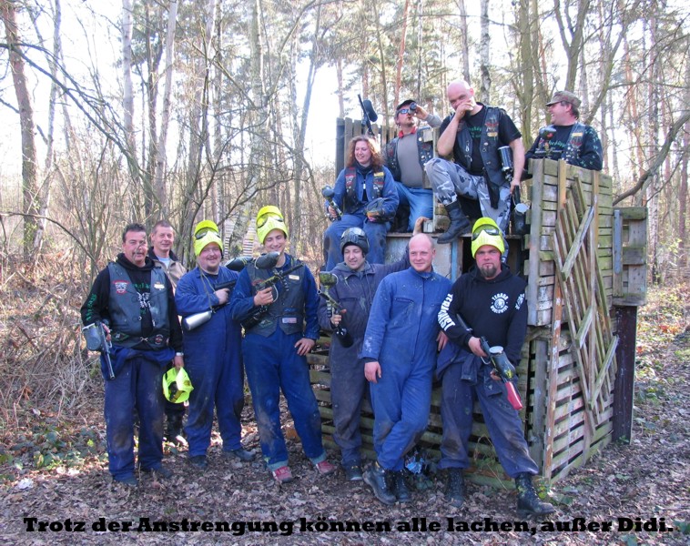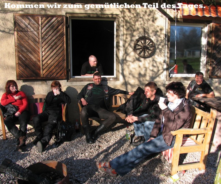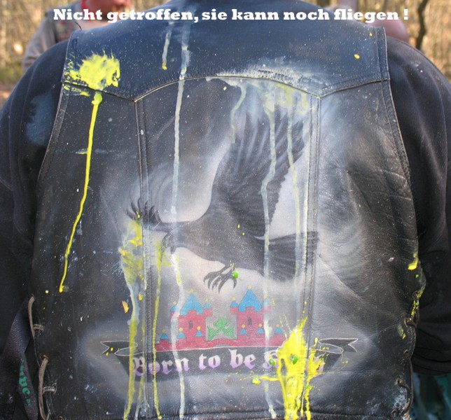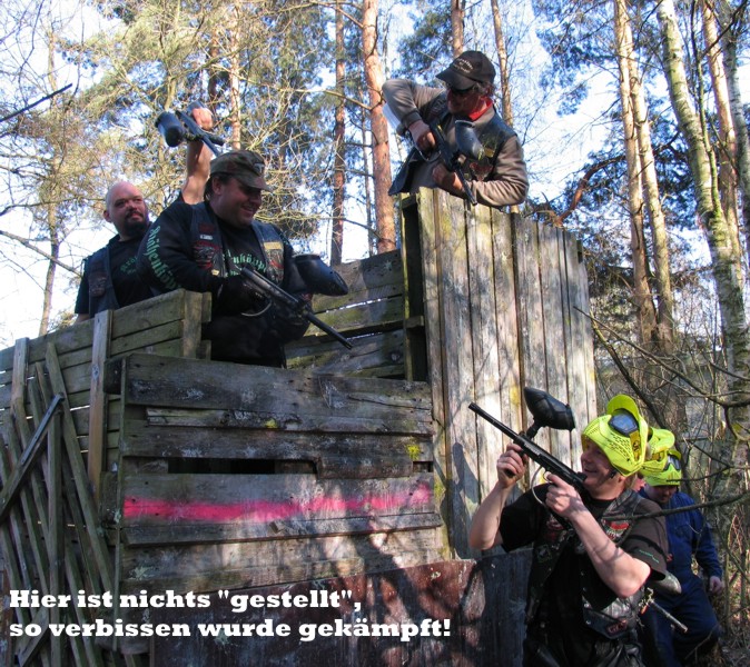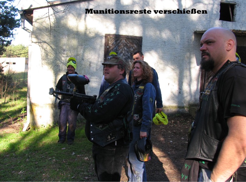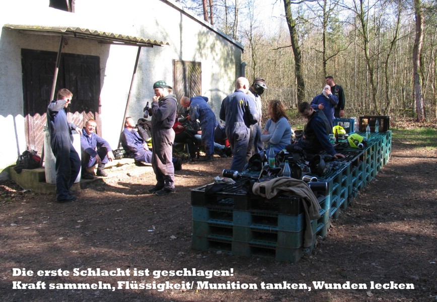 der Frühling ist da, die Tage werden länger und wärmer. Überall regt es sich in der Natur. Die Bienen fangen an zu summen (die Mücken sowieso). Sonnenstrahlen erwärmen langsam die Erde. Junge Pflanzentriebe durchbrechen die Muttererde auf der suche nach Licht. Bäume und Sträucher schlagen aus und bekommen von Tag zu Tag mehr grüne Blätter... Genau das richtige Wetter mal wieder den Wald unsicher zu machen... ...auf zum Paintball! Wie gesagt warme Erde = warmer Asphalt grüne Blätter = gute Deckung Mit den Motorrädern ging es nach Thüringen. In der Nähe von Gera hatten unsere Brahmetaler bei einem Paintball Verein ein Gelände gemietet. Dort konnten wir uns den ganzen Tag austoben. Ausrüstung und Farbkugeln gab es vor Ort. Das Gelände war super, ein ehemaliges Kinderferienlager aus DDR-Zeiten. Im angrenzenden Wald war das Paintballgelände mit Netzen abgegrenzt, darin hat der ansässige Verein aus Holzelementen Deckungen, Unterstände usw. gebaut um optimal spielen zu können. Nachdem genügend Farbe verschossen war und wir gleichmäßig Gelb gefärbt waren, duschten wir, stellten unsere Zelte auf und gingen zum gemütlicheren Teil des Tages über. Der Grill wurde entzündet, der Bierkasten in die Mitte gestellt und der Abend mit Benzingequatsche beendet.