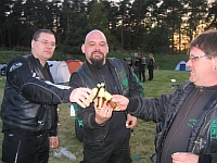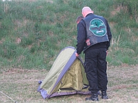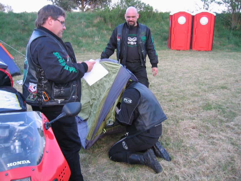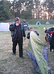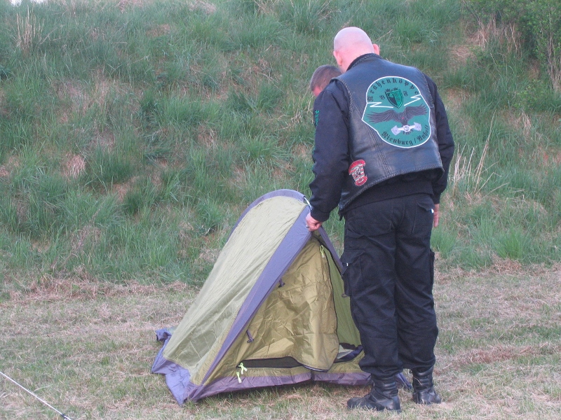 Dann kam das lästige Zeltaufbauen, haben wir gelacht. Mike hatte von irgendjemand mal ein Zelt geschenkt bekommen, welches jetzt erstmalig aufgebaut werden soll. 2 kurze Stangen und ne Zelthaut im Schlafsackformat. Wir ham schon einige Zelte gestellt, aber hier mussten wir erst mal die Beschreibung lesen. Irgendwann stand das Zelt und jetzt hat Mike versucht seine Doppelluftmatratze darin zu verstauen. Zu guter letzt wurde die Matratze erst im Zelt aufgeblasen, was wiederum dem Zelt nich passte. Hua ha ha ha!